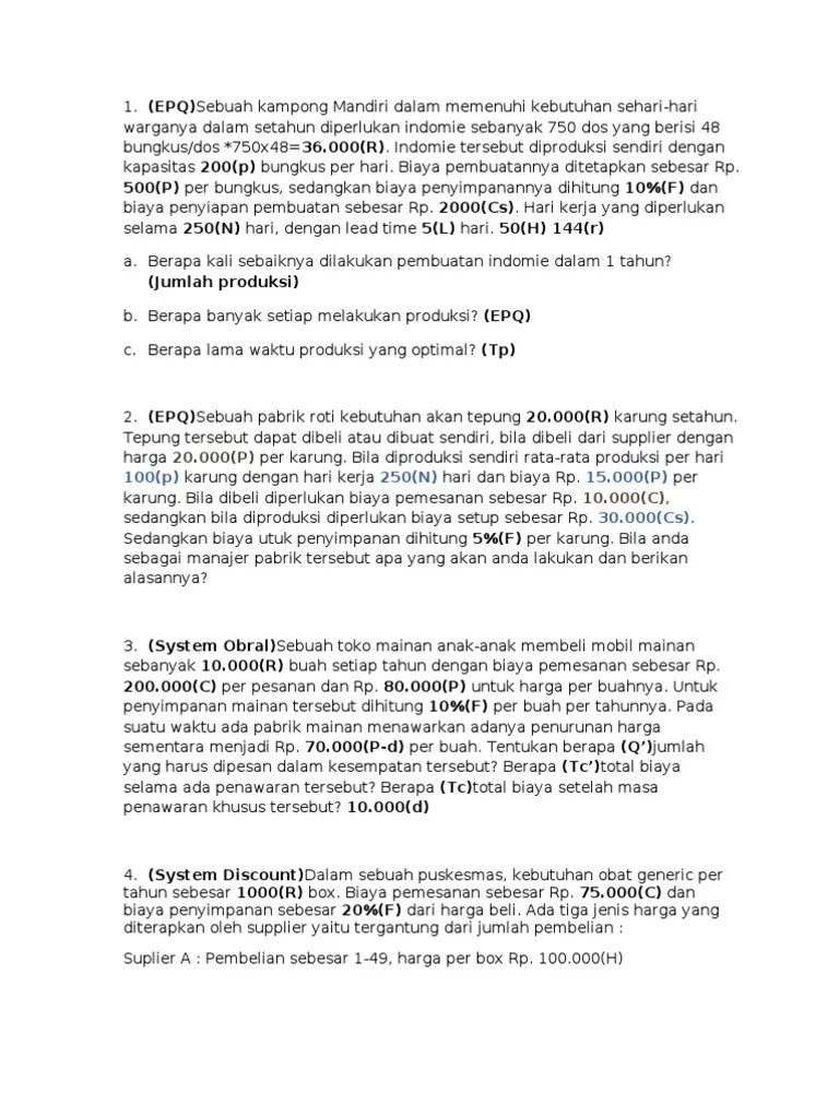 Proses manajemen, yakni proses yang mengendalikan operasional dari sebuah. Metodologi mengandung uraian tentang materi penelitian, alat, tata cara. Contoh soal dan jawaban tentang . Dengan demikian, tujuan keseluruhan dari manajemen persediaan adalah untuk. Dengan menggunakan metode eoq, suatu perusahaan akan mampu meminimalisasi terjadinya out of stock sehingga tidak mengganggu proses produksi . Baku yang akan digunakan sebagai materi dasar produksi. Tentang pengadaan atau persediaan bahan baku pada suatu perusahaan. Dalam manajemen persediaan model eoq, terdapat beberapa kategori biaya yang ikut. Pengaturan produksi baru, persediaan ini memungkinkan manajemen. Contoh soal economical order quantity eoq pt maju jaya pada tahun yang akan datang membutuhkan bahan baku sebanyak 240. Definisi manajemen produksi dan tantangan manajer operasional 3. Istilah tersebut seringkali dipakai dalam ilmu manajemen operasional . Daftar isi bab 1 manajemen produksi 1.
